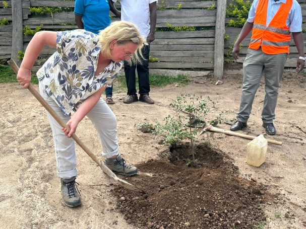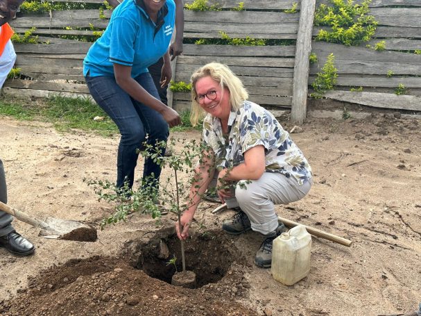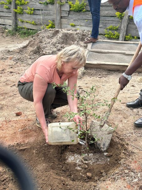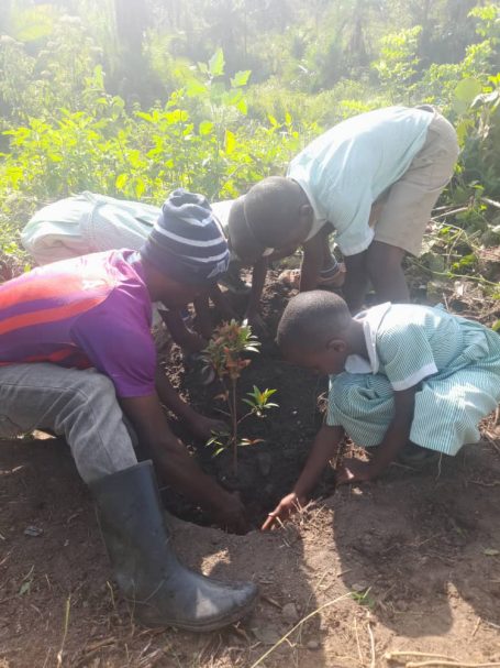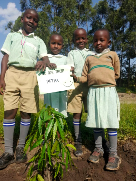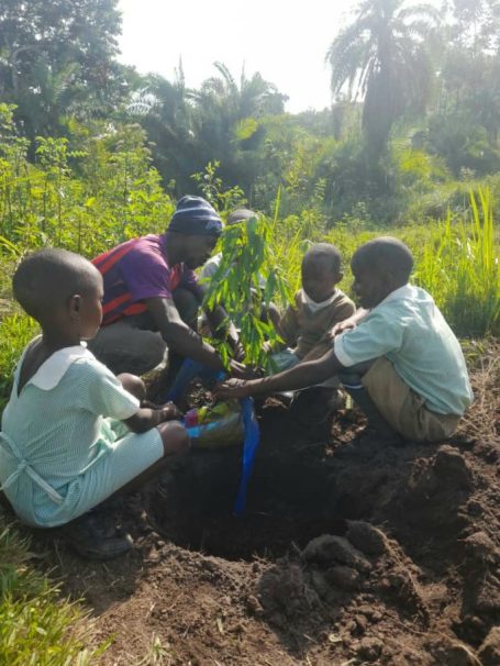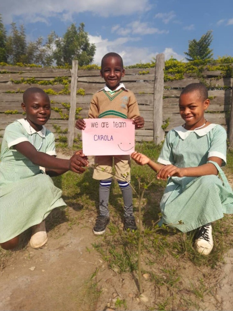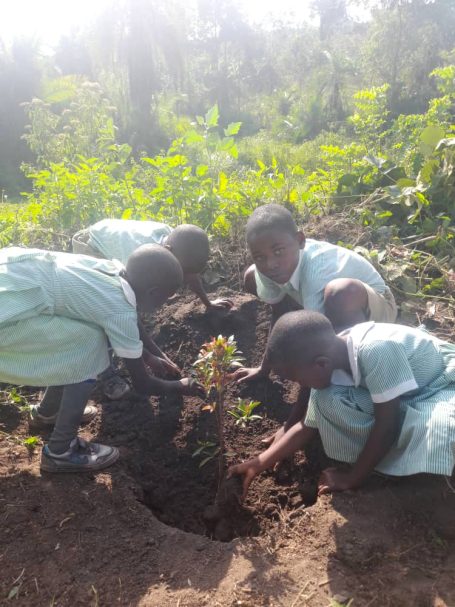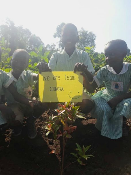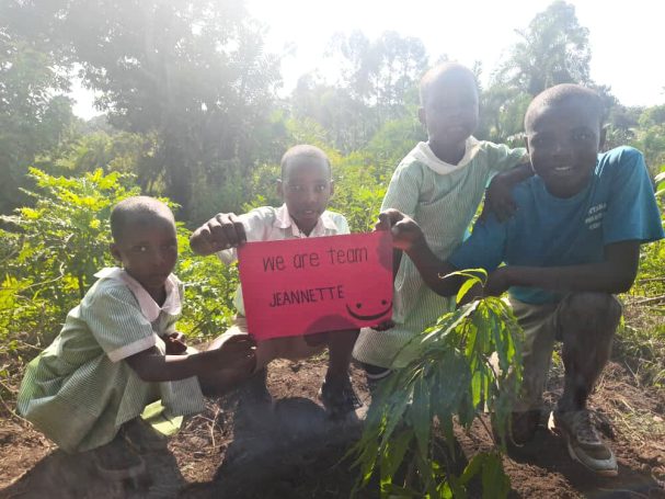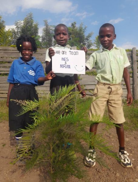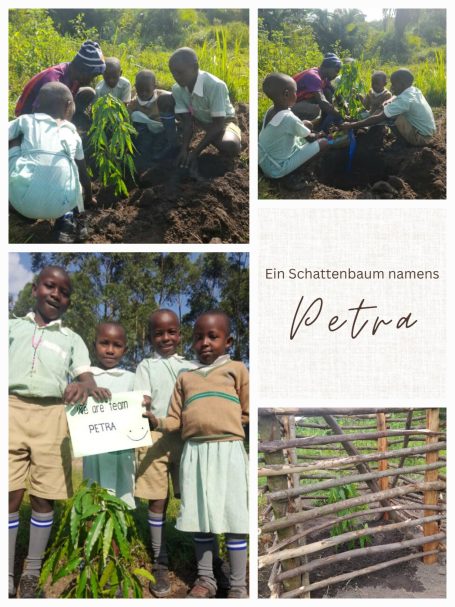 Es haben sich immer bis zu vier Kinder zusammengefunden, um einen gespendeten Baum zu pflanzen. Jede Kindergruppe kümmert sich um ihren jeweiligen Setzling, damit dieser gut wachsen kann. Derzeit herrscht Trockenzeit in Uganda, daher muss zum Beispiel noch gegossen werden. Die Bäume spenden zukünftig nicht nur Schatten, sie sind auch jeweils einem lieben Menschen gewidmet und tragen dessen Namen.